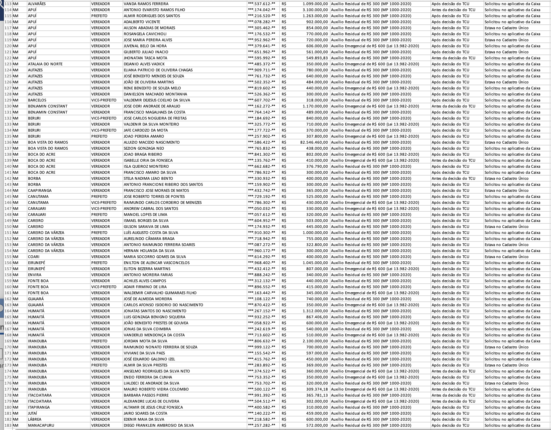 O Amazonas tem 140 candidatos que declararam patrimônio igual ou superior a R$ 300 mil e que receberam alguma parcela do auxílio emergencial até julho de 2020. Os nomes constam da lista divulgada pelo ministro Bruno Dantas, do Tribunal de Contas da União (TCU). Em alguns casos, o patrimônio declarado pelo candidato é superior a R$ 1 milhão.