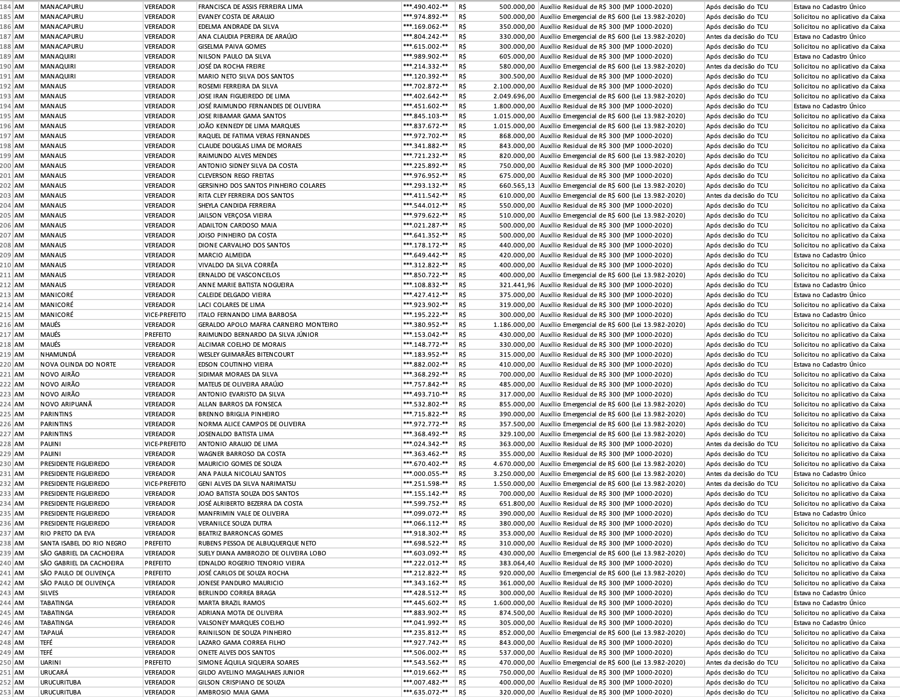 O Amazonas tem 140 candidatos que declararam patrimônio igual ou superior a R$ 300 mil e que receberam alguma parcela do auxílio emergencial até julho de 2020. Os nomes constam da lista divulgada pelo ministro Bruno Dantas, do Tribunal de Contas da União (TCU). Em alguns casos, o patrimônio declarado pelo candidato é superior a R$ 1 milhão.