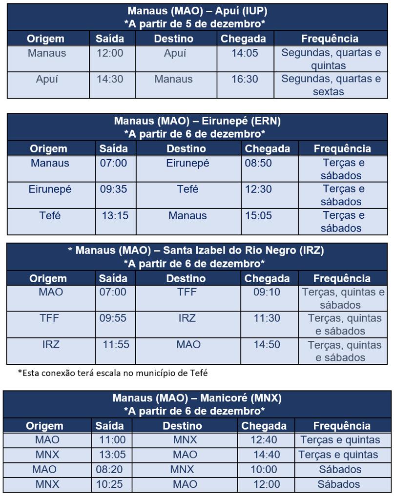 As operações para Apuí, Borba, Manicoré e Santa Isabel do Rio Negro acontecerão a bordo das aeronaves modelo Cessna Grand Caravan, com nove assentos. Já a rota para Eirunepé, será a bordo da ATR 72-600, com capacidade para 70 passageiros.
