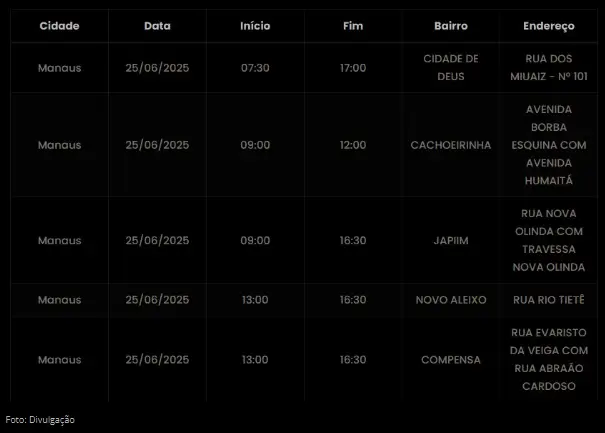MANAUS, AM — A Amazonas Energia informou que realizará manutenção preventiva na rede elétrica nesta quarta-feira (25), o que resultará na interrupção temporária do fornecimento de energia em cinco bairros de Manaus.