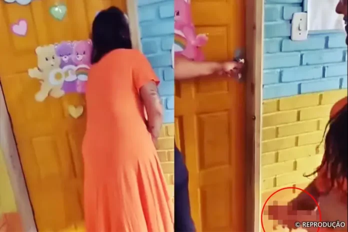 No vídeo, a diretora aparece na porta de uma sala de aula e aparentemente chama uma colega e, da porta, diz “”você não pode ver o que eu vou mostrar para [nome da colega], fica aí, fica aí”.