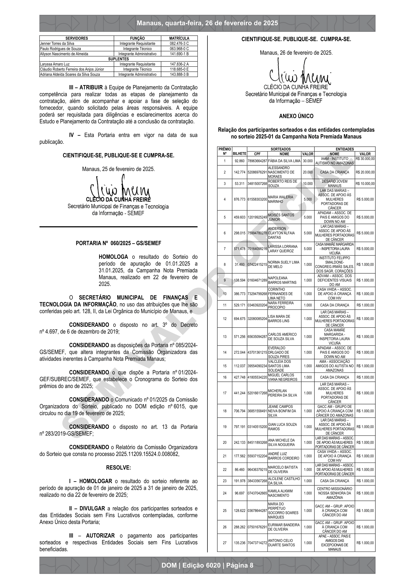 MANAUS, AM — A Prefeitura de Manaus divulgou os nomes dos ganhadores do primeiro sorteio do ano da campanha Nota Premiada Manaus. Fabia da Silva de Lima foi a grande vencedora do prêmio principal de R$ 30 mil. Ela indicou o Instituto Autismo no Amazonas (IAAM) para receber igual premiação.