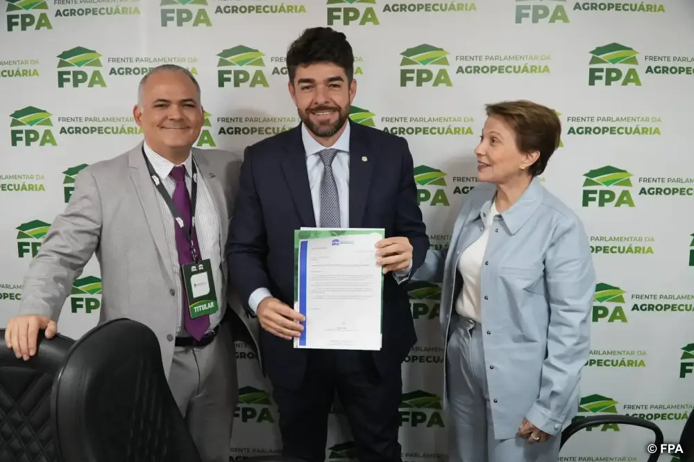 Carta de apoio ao PL do licenciamento foi entregue pelo vice-presidente do Instituto Pensar Agro, Fabrício Rosa, ao relator Zé Vitor (no centro).