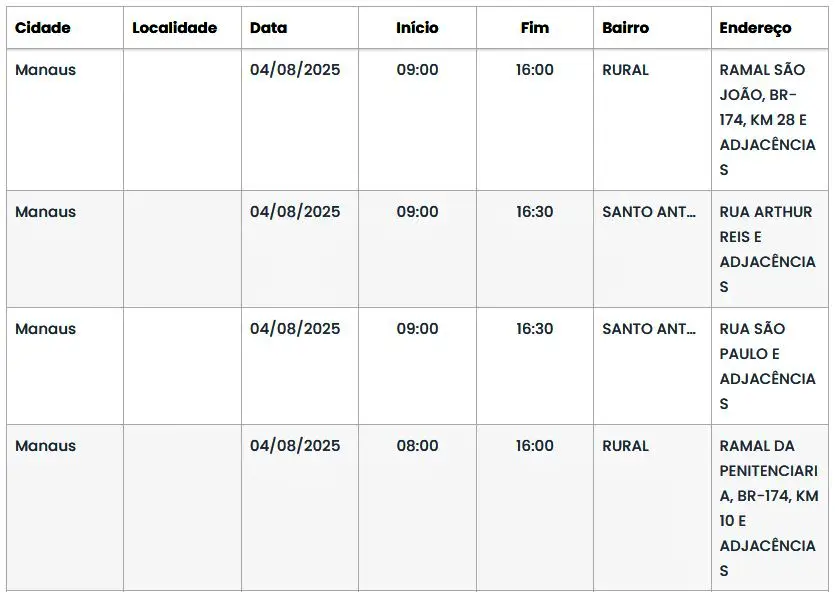 MANAUS — Nesta segunda-feira (4), moradores do Santo Antônio (zona oeste) e do Novo Aleixo (zona norte) terão o fornecimento de energia interrompido por algumas horas devido a manutenções na rede elétrica. Segundo a concessionária, apenas ruas específicas serão afetadas, além de alguns trechos da BR-174.