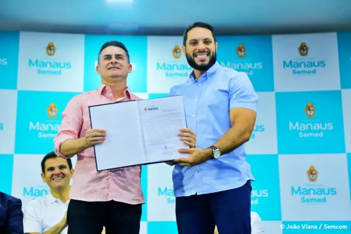 MANAUS, AM – O prefeito de Manaus, David Almeida, empossou nesta terça-feira (1º) o professor Júnior Mar como novo titular da Secretaria Municipal de Educação (Semed) e o professor Arone Bentes como subsecretário de Gestão Educacional. A cerimônia, realizada na sede da Semed, marcou o início de uma nova fase para a educação municipal, com anúncios importantes que reforçam o compromisso da gestão com a qualidade do ensino na capital amazonense.