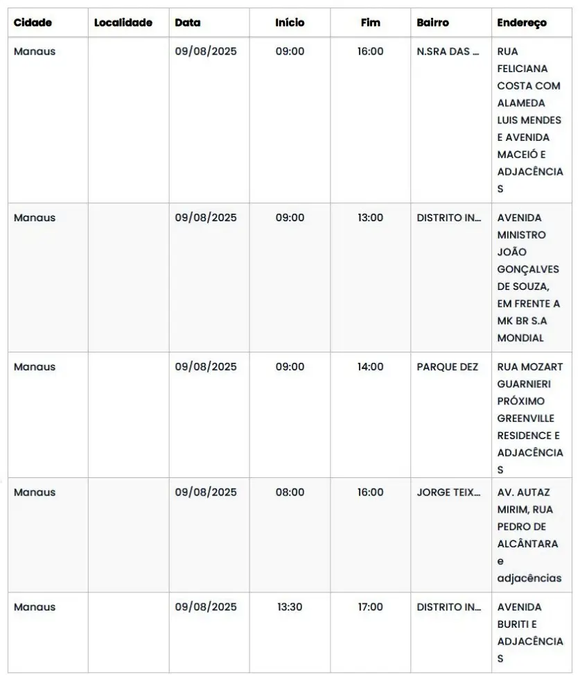 MANAUS (AM) — Manaus terá interrupção no fornecimento de energia neste sábado (9), em quatro bairros. A manutenção afetará ruas e avenidas no Parque 10, Jorge Teixeira e outros locais, conforme anunciado pela concessionária; confira os trechos impactados.