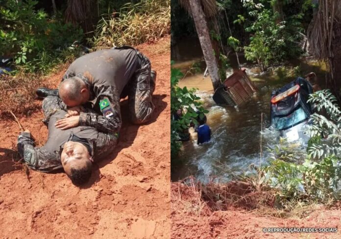 Imagens que circulam nas redes sociais mostram o veículo parcialmente submerso. Em uma das cenas, o subtenente Dias aparece sem vida, enquanto um colega de farda, visivelmente abalado, permanece ao seu lado, demonstrando forte comoção diante da perda.