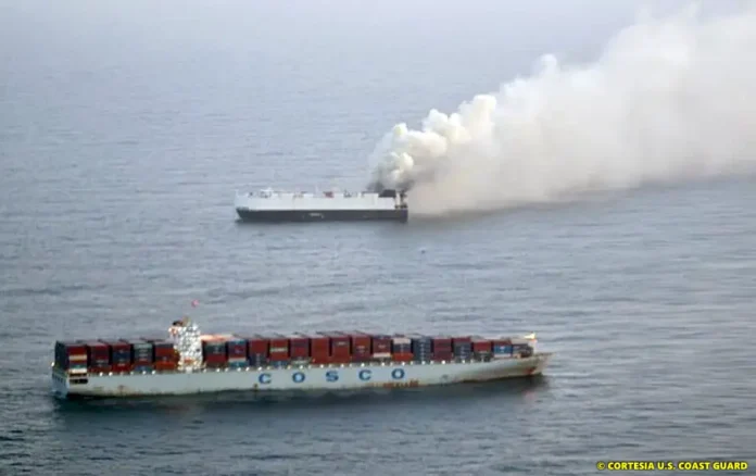 EUA — O cargueiro Morning Midas, que partiu de Yantai, na China, em 26 de maio, está em chamas há quase uma semana no meio do Oceano Pacífico, a cerca de 480 km da costa do Alasca. A embarcação, operada pela Zodiac Maritime, transportava cerca de 3.000 veículos, dos quais aproximadamente 800 eram elétricos e modelos híbridos.Evacuação e resgate