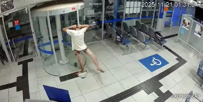 MINAS — Um assalto frustrado virou cena cômica na madrugada da última sexta-feira (21), no centro de Carangola, na Zona da Mata mineira. Um jovem de 20 anos foi flagrado por câmeras de segurança invadindo uma agência bancária, danificando caixas eletrônicos a socos e chutes, mas acabou encurralado na porta giratória, onde ficou entalado por quase 20 minutos – primeiro pela cintura, depois pelo pescoço –, perdendo as calças no processo e terminando de cueca.