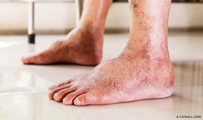- pele seca e pés rachados, especialmente nos calcanhares;