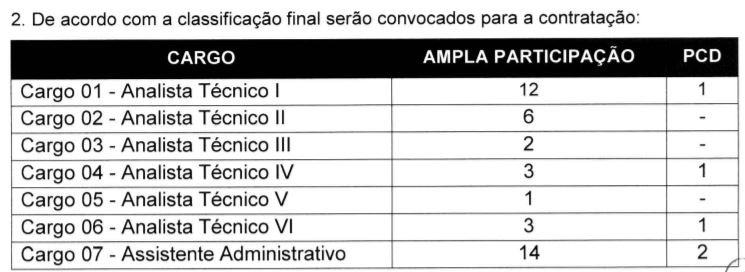 O número de vagas para cada função, inclusive para as pessoas com deficiência, juntamente com as atribuições e os requisitos obrigatórios para elas, local de trabalho, carga horária e salário correspondentes encontram-se descritos no Quadro de Cargos, Anexo I do Edital.