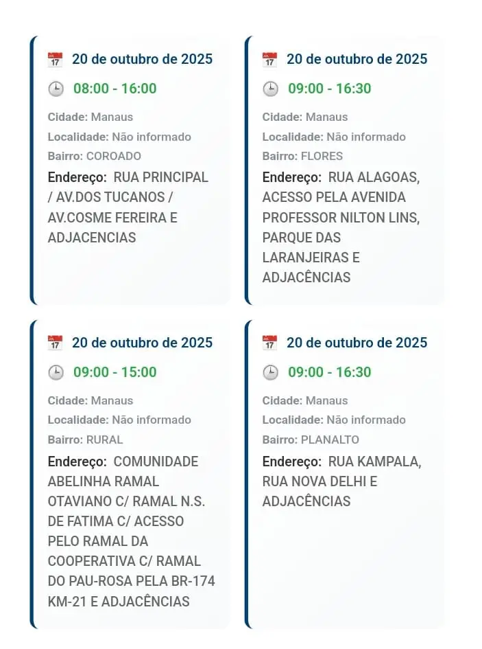 MANAUS, AM — Nesta segunda-feira (20), a rede elétrica em quatro localidades de Manaus passará por obras de manutenção preventiva, resultando em cortes programados de fornecimento. A interrupção está agendada para iniciar às 8h, com duração temporária, visando aprimorar a infraestrutura e evitar falhas futuras.