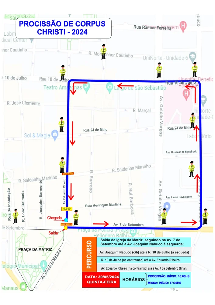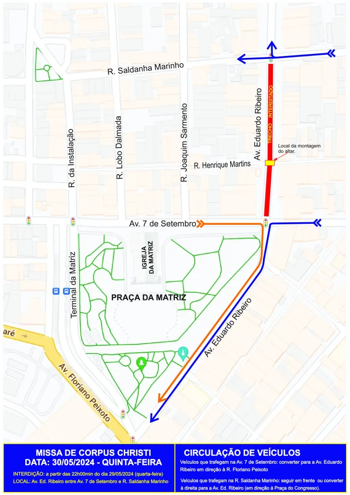 MANAUS — A Prefeitura de Manaus, por meio do Instituto Municipal de Mobilidade Urbana (IMMU), vai interditar a avenida Eduardo Ribeiro, no trecho entre a avenida 7 de Setembro e a rua Saldanha Marinho, a partir das 22h desta quarta-feira, 29/5, para a realização da missa de Corpus Christi, que ocorrerá na quinta-feira, 30/5, às 16h. Além da celebração, será realizada também uma procissão, no mesmo dia, que contará com interdições temporárias em outras vias do Centro da cidade.
